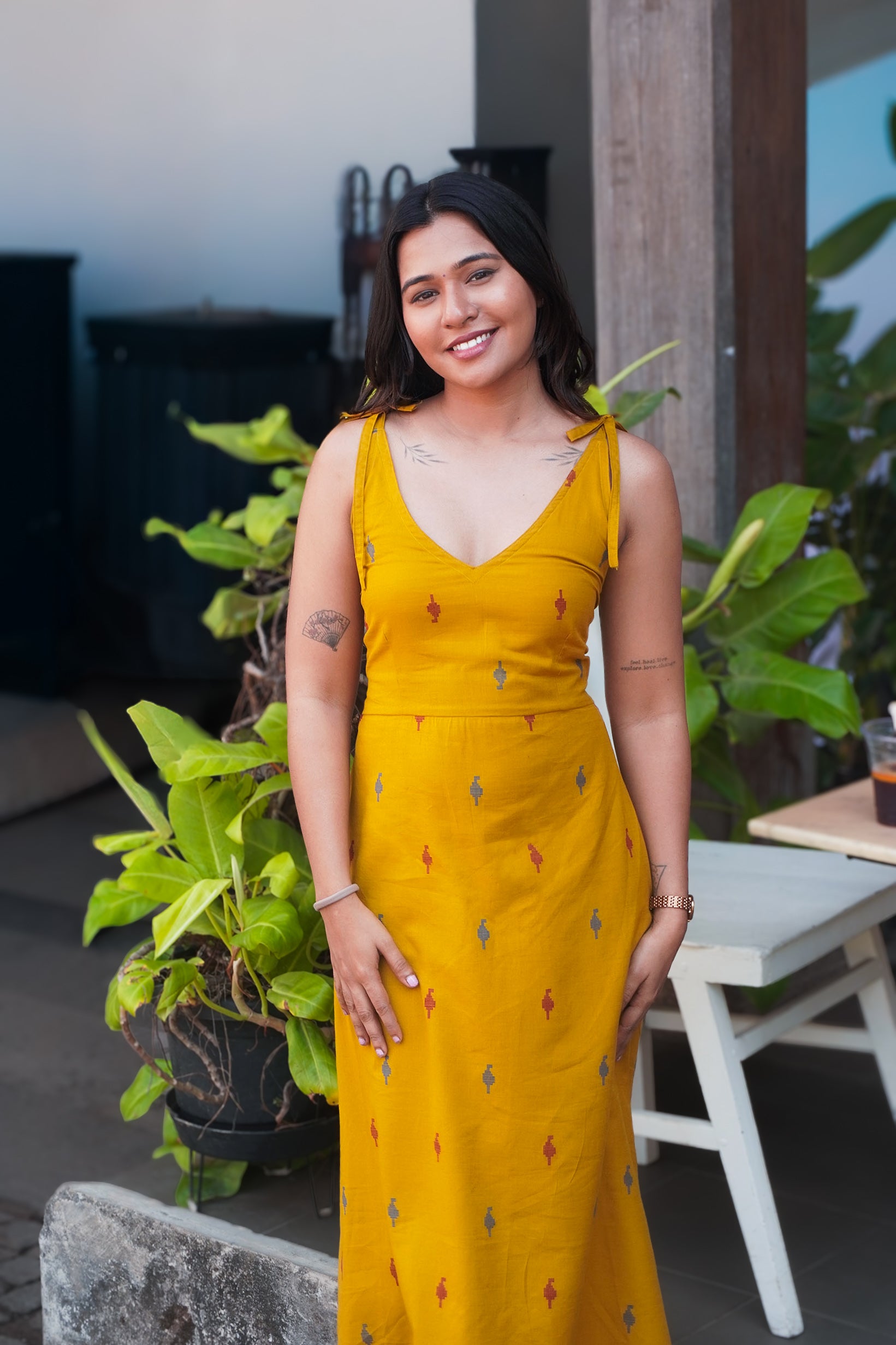 Features- Tie Up Dress, Halter Neck, Handblock Prints, Elastic Smocking on the back.